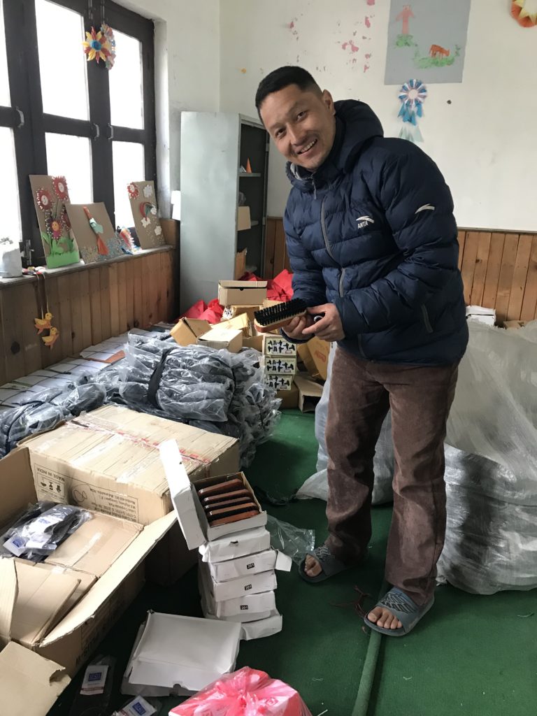 Mangal Sing Pun, directeur de Yogendra school à Tukuche, montrant le matériel acheté pour les élèves